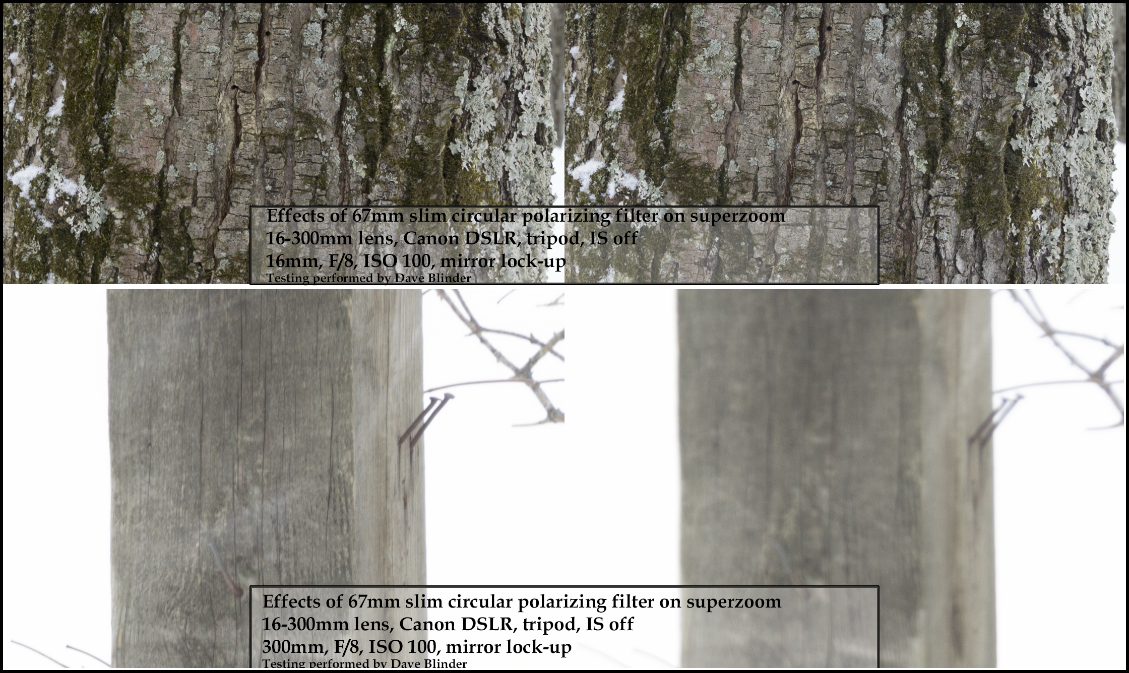 I’d been recently caught off guard by the lack of sharpness on the long end of my 16-300mm VC lens so I performed a brief test with and without my frequently used 67mm circular polarizing filter. The drop off in sharpness is completely the fault of the filter. At 16mm with my polarizing filter mounted I do get a very sharp image, but at 300mm with the polarizing filter the photos become very hazy. There is no noticeable loss of sharpness from wide to telephoto end without the filter. The filter used is a 67mm slim Zomei filter.