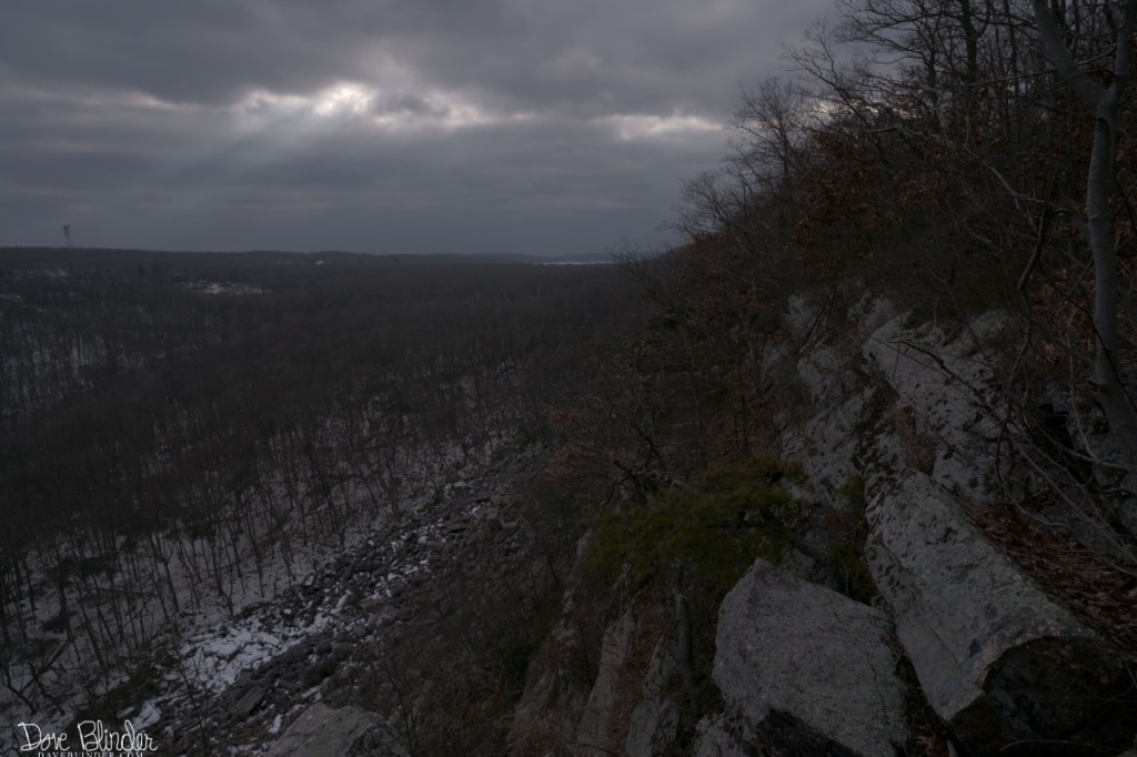 A winter hike up the rugged Four Birds Trail lead to a brief view of sunbeams above Green Pond.